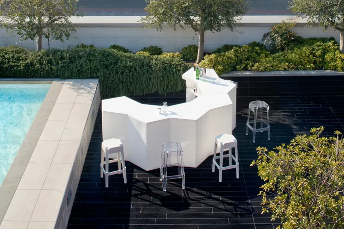 Le Iceberg Block of Ice est un bar modulaire imaginé pour ressembler à un véritable bloc de glace. Sa structure anguleuse et ses surfaces brillantes en font une pièce idéale pour les espaces extérieurs ou les ambiances lounge.
