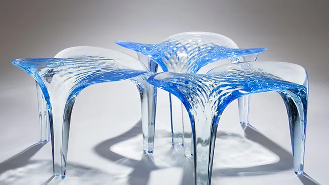 La collection Liquid Glacial, conçue par Zaha Hadid, réunit sièges et tables en acrylique translucide qui semblent littéralement dériver d’une formation glaciaire. Les surfaces ondulées donnent l’impression que la matière est en mouvement, comme de l’eau soudain figée.