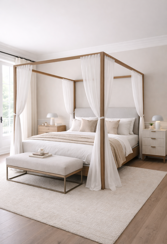 Le lit à baldaquins, souvent associé à un style classique, peut être revisité grâce à une structure en bois aux lignes nettes et peu travaillées. Des voilages blancs très simples, sans broderies ni détails décoratifs, allègent visuellement l’ensemble. Le résultat conserve la présence du baldaquin, tout en évitant l’effet trop traditionnel.