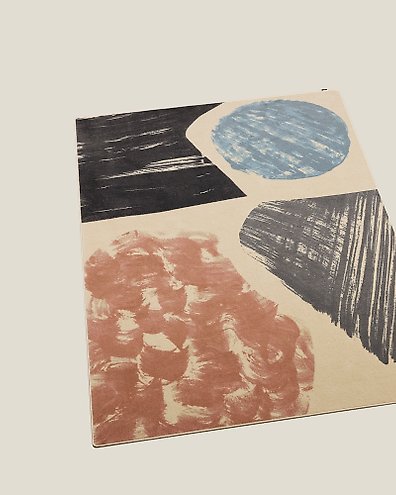 Les motifs des tapis et textiles répondent à ces meubles avec des formes abstraites irrégulières et imparfaites, évoquant avec distance des pierres, des bulles, des mousses, des brindilles…
