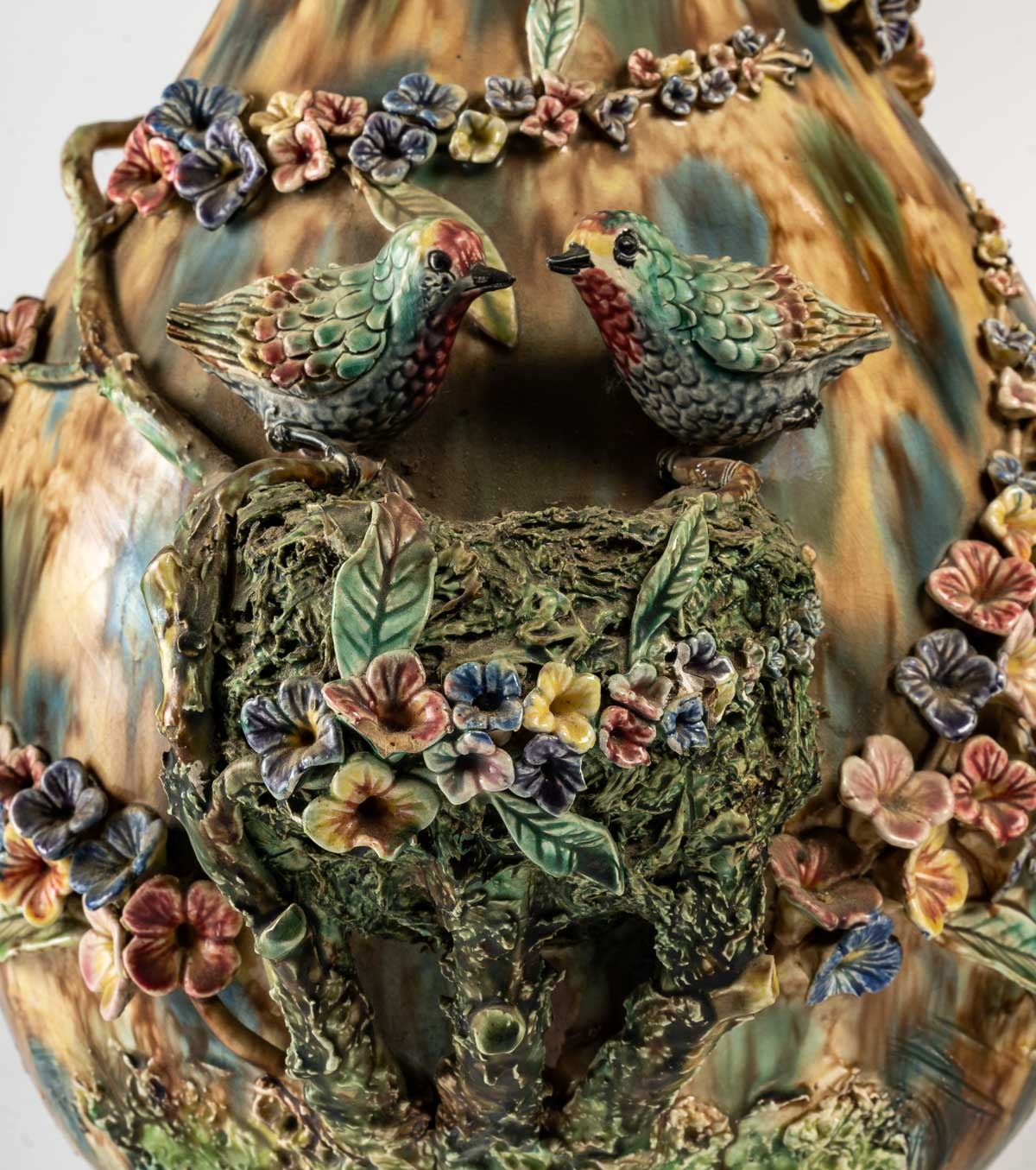 Mais c’est aussi une technique mise au point au milieu du XIXe siècle par la Manufacture de Sèvres : le fait de couler une pâte délayée et teintée aux oxydes dans un moule (comme on le fait pour la porcelaine). A l’aide de cette technique, on réalise des décors colorés, très élaborés, riches de détails, et le plus souvent naturalistes (imitant la nature).